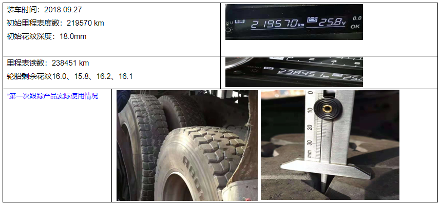 轮胎从2018.09.27装车使用到2018.12.21,共使用85天,行驶50888km。轮胎磨损良好,几乎没有划伤、啃伤,司机对使用效果非常满意